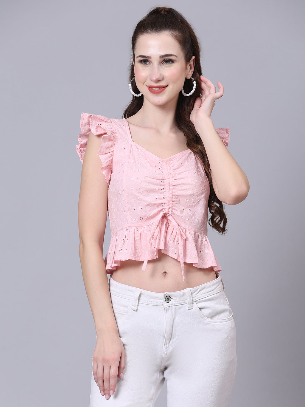Flaunt your style with this ruffled crop top with ruching at the center front. The most trendy top with drawstrings can be adjusted as per your want on waist. Pull up the drawstring to make it a crop top or just loosen it to c...