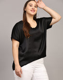 Make a statement on those fashionable evenings by wearing this Black satin number. It features a regular fit and has a simple U-neckline. Perfect for dinners and parties, this top is very easy to style. Sport your hair up for this one and style the top with anything that comes to your mind, skirts or trousers