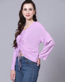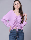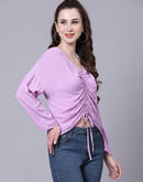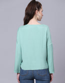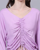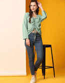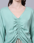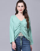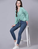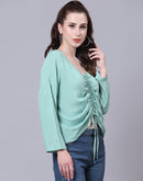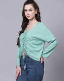 Upgrade your fashion collection with this beautiful green top. Tailored in the finest material, this piece features a V-neck and a front drawstring to adjust your style according to the occasion. Transit from a formal event to a casual scene without any effort.