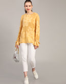 Super versatile and a statement by itself, this Mustard viscose jacquard top has an artistic touch to it and is made for the sophisticated ones. This sheer top is one to watch for! This shirt offers a jacquard sheer fabric and gathered cuff sleeves with bow to add a flair of stylishness and sophistication.