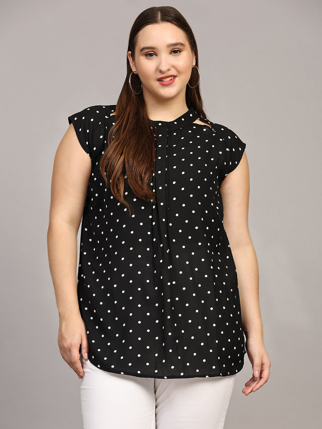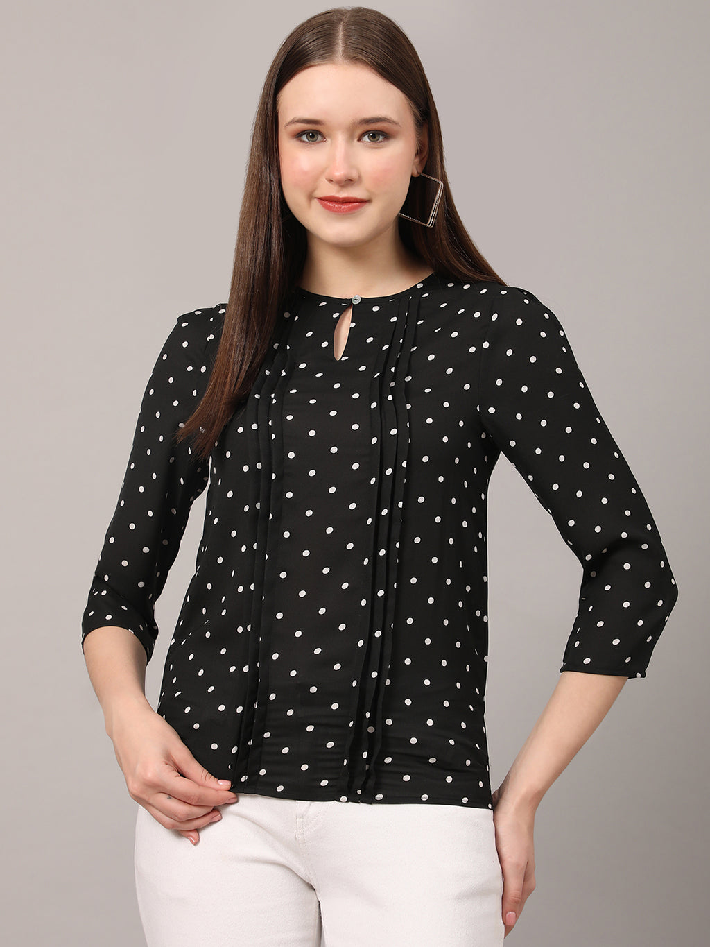 Dress like an icon in this cute polka-dot top. Sporting many white polka dots along with a front panel of the pintucks, this black top is a must-have this season. The round neckline with a small button provides comfort all day...