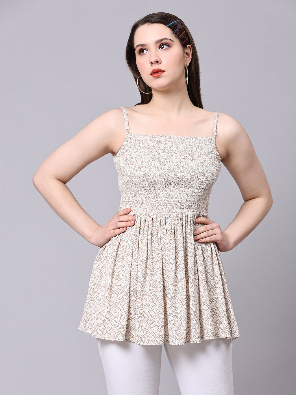 Looking for that one perfect summer addition to your wardrobe? Worry not! We have the cutest, comfiest, and most wearable beige smock top for this very purpose. With clean straps, a square neckline, and a ruched bodice, this to...