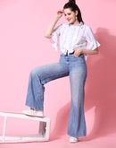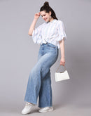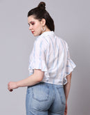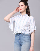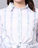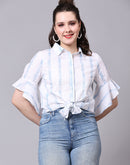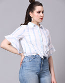 Cool and comfortable, this white tie-up shirt has blue paint brush-inspired stripes and is here for the fashion forward. Made for independent women who live and breathe freedom, this shirt has a collared neck, buttons till the end, and beautiful ruffles by the sleeves.