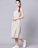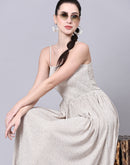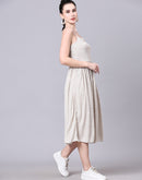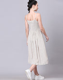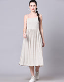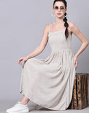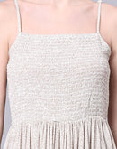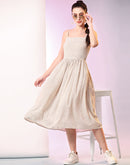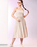 The perfect picnic outfit, this strappy beige smocked dress has a subtle print with a ruched bodice and a square neckline which makes it a sophisticated style statement. Inspired by global trends and keeping in mind the women of today, this viscose piece is flowing and can easily be taken from work to the weekend.