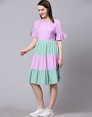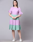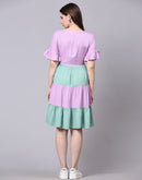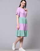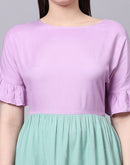 We proudly presently to you a dreamy dress for a feminine elegant look. Add some cheer with a splash of two colors in purple and green colors. Made on a Rayon fabric and vertical patterns this fun and comfortable dress is a sight to look. This statement-making flowy skirt with round neck keeps the ultra-feminine vibes alive . This below knee length dress features short sleeves with flared ends