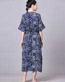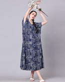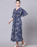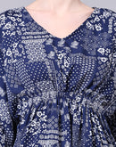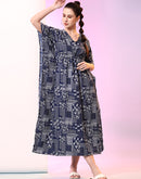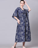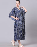 Comfort and kaftans are synonymous.Nothing speaks class and elegance like the way Kaftans do, Make this blue Kaftan maxi dress a part of your must-have . Show some self-love in this blue abstract printed Kaftan. This gorgeous maxi dress features short sleeves, and a stylish V-neckline which brings royalty to life.