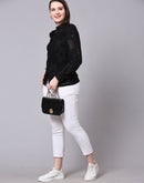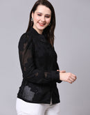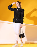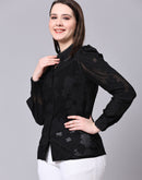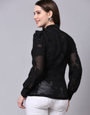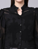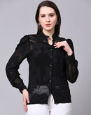 Here is to help you create and expand your sense of style, our black lace sheer shirt is one to watch for! This shirt offers a jacquard sheer fabric, lace details, panels that run along the chest to create complexity, and a Chinese collar to add a flair of stylishness and sophistication. Super versatile and a statement by itself, this black viscose jacquard top has an artistic touch to it and is made for the bold.