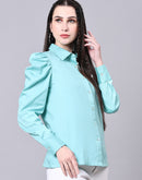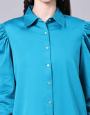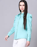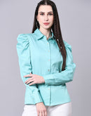 Dress to kill in this stylish and smart shirt for women. Taking inspiration from the 1960s the shirt features puffed leg o mutton sleeves with cuffed ends perfectly wrapping your wrist. This versatile Sea Green shirt ideal for any formal meet and informal gathering as well.Fabricated on cotton fabric the collared shirt features front button closure. This vintage-inspired shirt is a must have addition to your wardrobe as it is timeless, versatile.