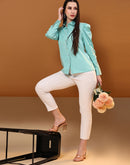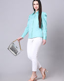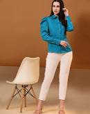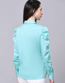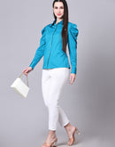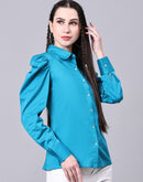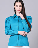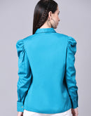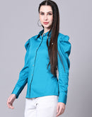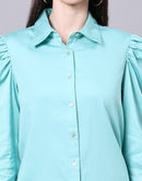 Dress to kill in this stylish and smart shirt for women. Taking inspiration from the 1960s the shirt features puffed leg o mutton sleeves with cuffed ends perfectly wrapping your wrist. This versatile teal blue shirt ideal for any formal meet and informal gathering as well.Fabricated on cotton fabric the collared shirt features front button closure. This vintage-inspired shirt is a must have addition to your wardrobe as it is timeless, versatile.