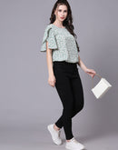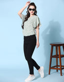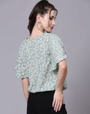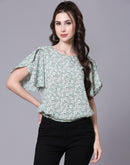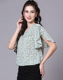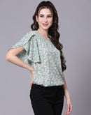 Treat yourself to a chic showoff top and reap its endless style and comfort benefits. this beautiful floral piece strikes the absolutely perfect note when you're going out for a drink with your current flame when you pair it with a wedge heels and flowing skirt. The flared petal sleeves add to the comfort of your style.
