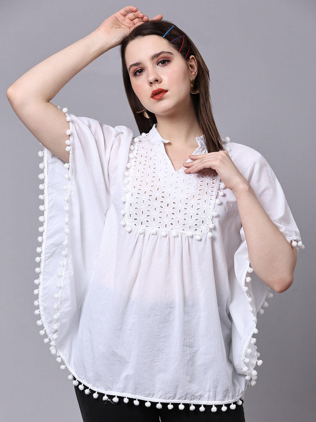 In perfect shade of white we bring to you this stunning women top. Show your best sense of style in this embroidered cotton top. The top features fringe detailing around the shoulder. The full sleeves are elasticated at the w...